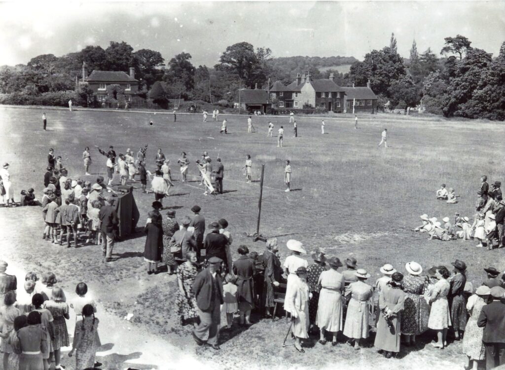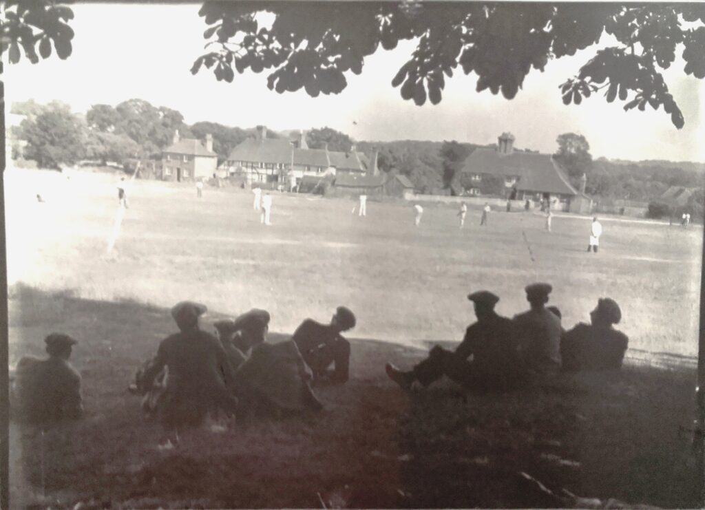 Garland developed a special skill at capturing Sussex rural life and characters of the 1920s to the 1940s and beyond.   This iconic scene of Lurgashall Green in 1940 is one of his most evocative, with the men in caps sitting under the spreading chestnut tree watching a game of cricket…  [Garland N19552]