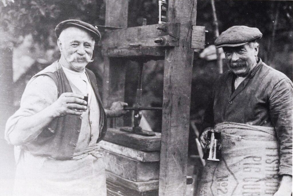 Dick Bicknell and Jesse Dalman with their cider press at Hillgrove, 1933